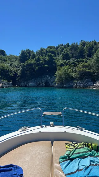 The boat is located at Medulin Port and comes equipped with essential amenities such as life vests, an anchor, ropes, a depth meter, sunroof, shower, bluetooth radio and ample storage space. A valid boat license is necessary for self-rental, however, there's an option to hire a skipper for an additional fee (€120 for a full day, €80 for a half day).