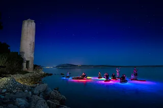 Caska beach, located on the north-western part of the Pag bay, is one of the best-known beaches of the island thanks to its shallow sandy bay, and as such it is an exceptional starting point for a guided SUP tour. After receiving introductory instructions and the equipment from the guide, the tour departs towards Zrće beach, the most popular party beach, which you will experience in a completely different way, enjoying the panoramic view from the sea. While paddling towards Zrće beach you will get to know the unique landscape of the Pag bay. The first break for rest and some swimming is planned once you arrive at the beach. As the sun slowly sets and the evening ambience takes place, the tour continues towards the impressive Tunera, a former tuna fish observation tower, on the opposite side of the bay. After the sunset, colorful lamps under the SUP boards are turned on to illuminate the sea, which enables an unforgettable nocturnal experience of the sea. Approaching the Tunera tower, you will enjoy the view of the shimmering sandy seafloor, and maybe even get to feel a sense of the past while paddling over a submerged Roman settlement. The second swimming break is planned by the Tunera tower. After the break you will return to Caska beach where you can enjoy night swimming.
